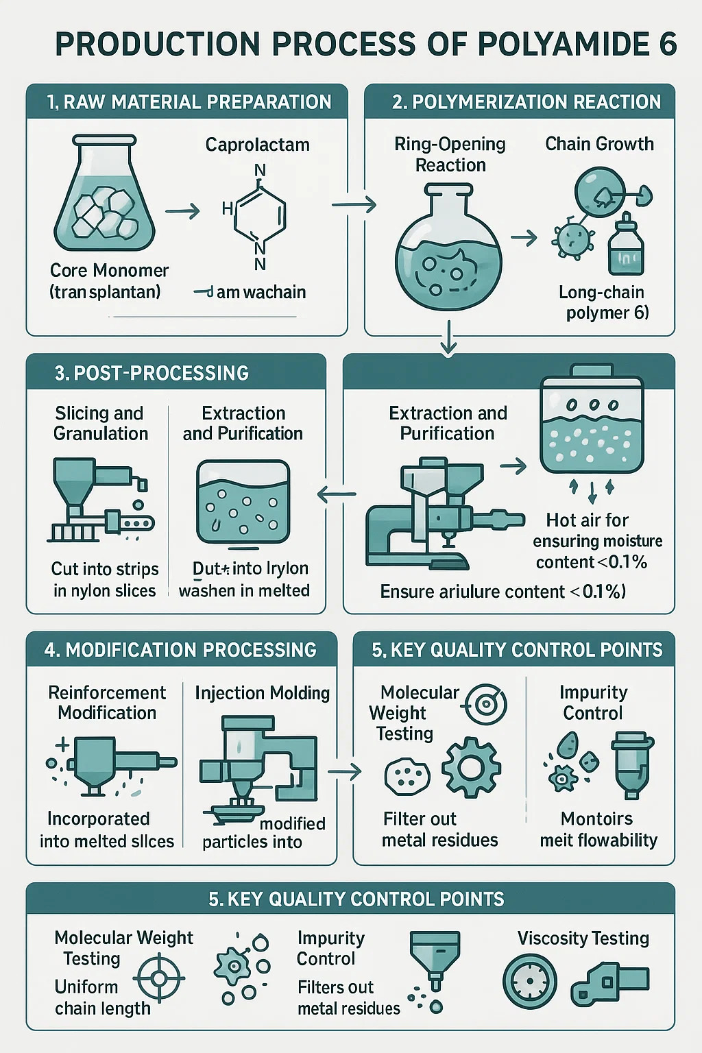 Core Monomer: Caprolactam (a transparent crystal), produced from benzene extracted from petroleum through a multi-step reaction.