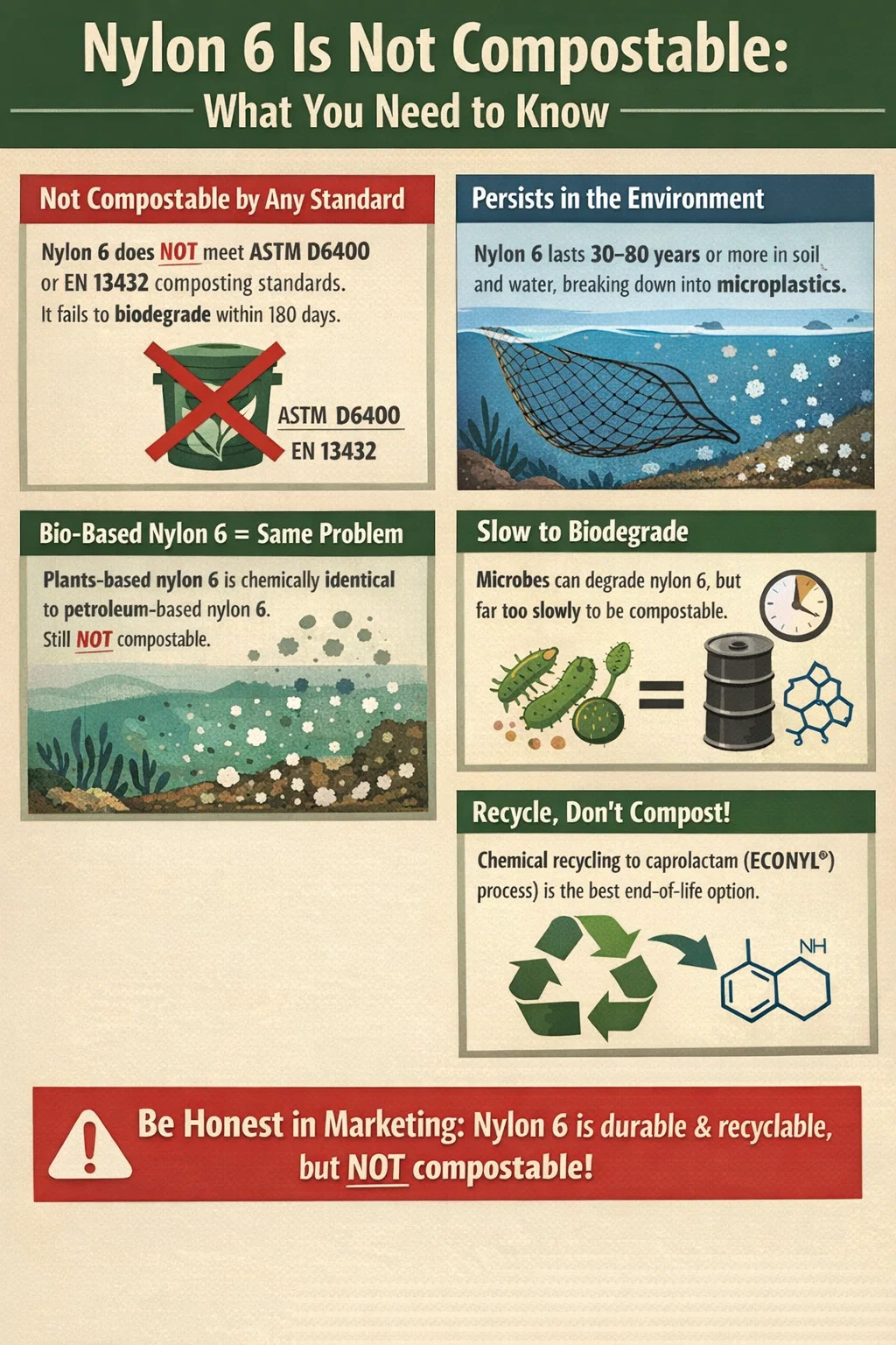 - Nylon 6 is not compostable under home or industrial composting standards (ASTM D6400, EN 13432). It does not meet biodegradation rate or disintegration requirements.