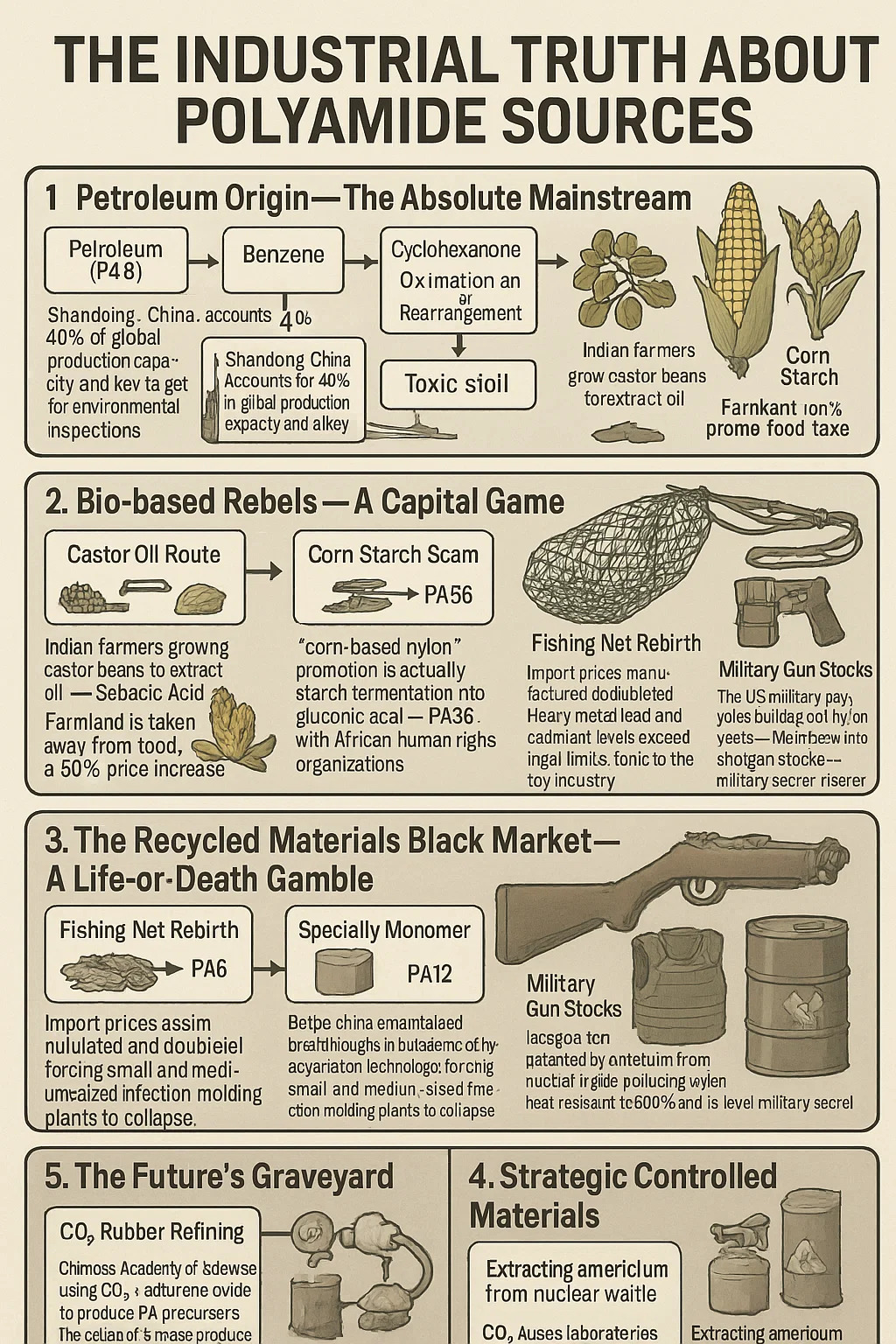 Corn Starch Scam: The "corn-based nylon" promotion is actually starch fermentation → gluconic acid → PA56, with a 1:5 grain consumption ratio, which has been boycotted by African human rights organizations.